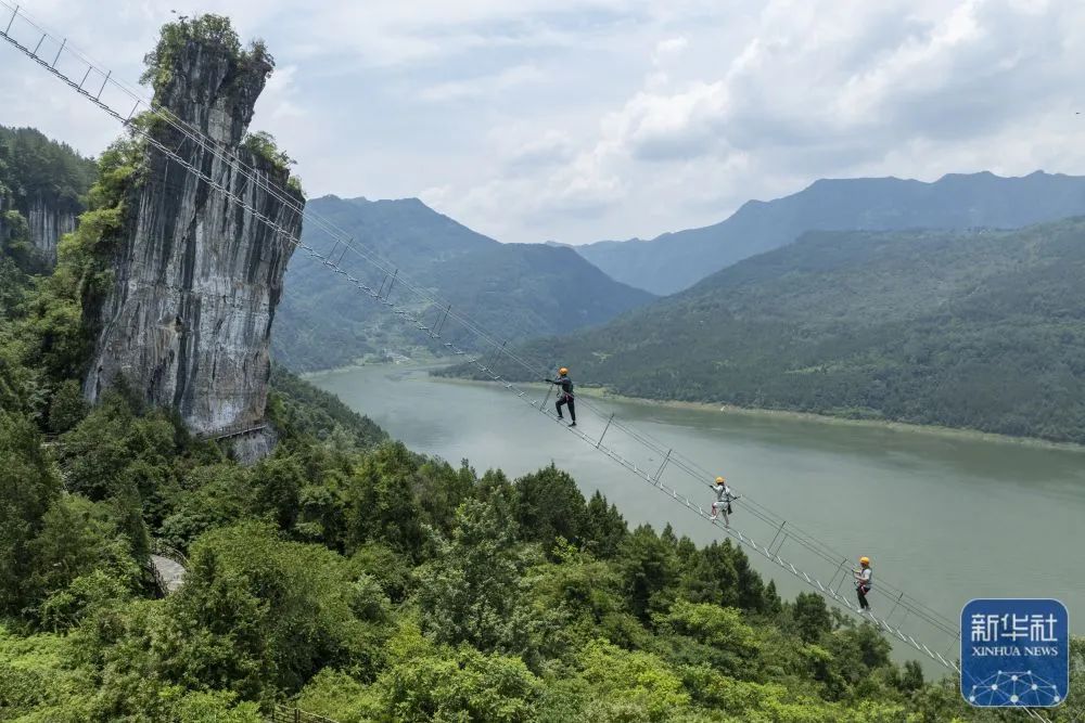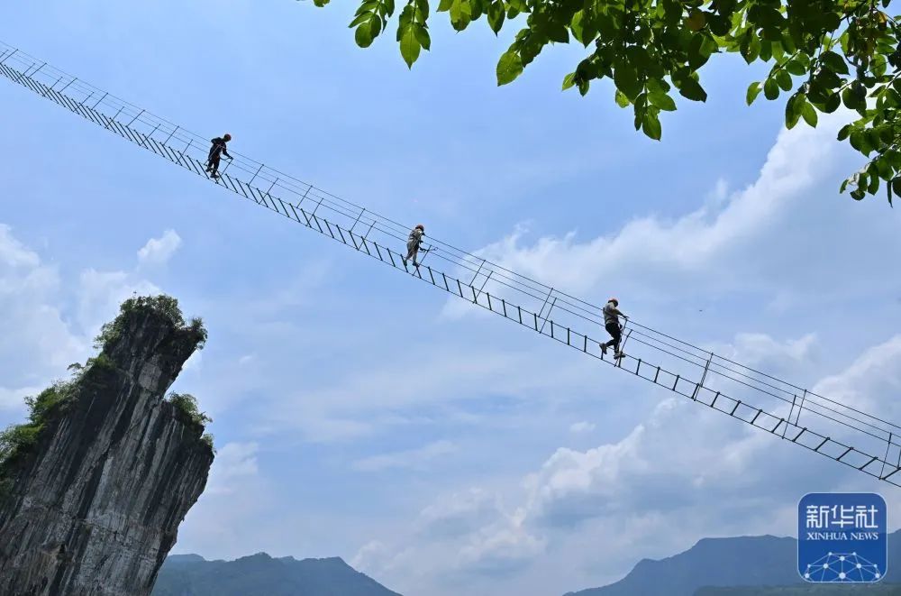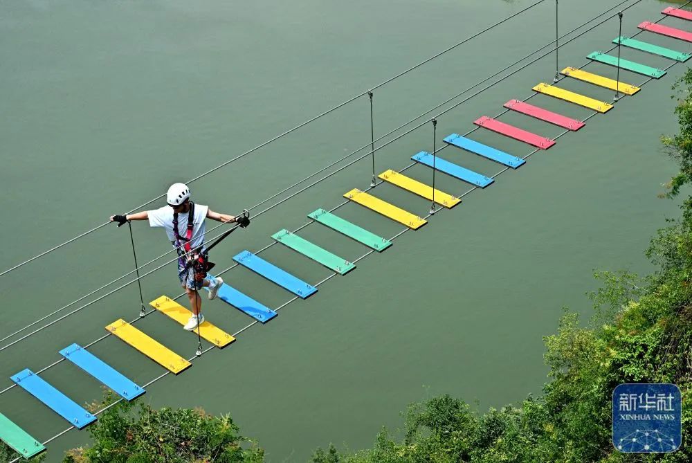 湖北省恩施市新塘鄉紅花峰林景區,游客在體驗“彩橋”項目新華社發(宋文攝)