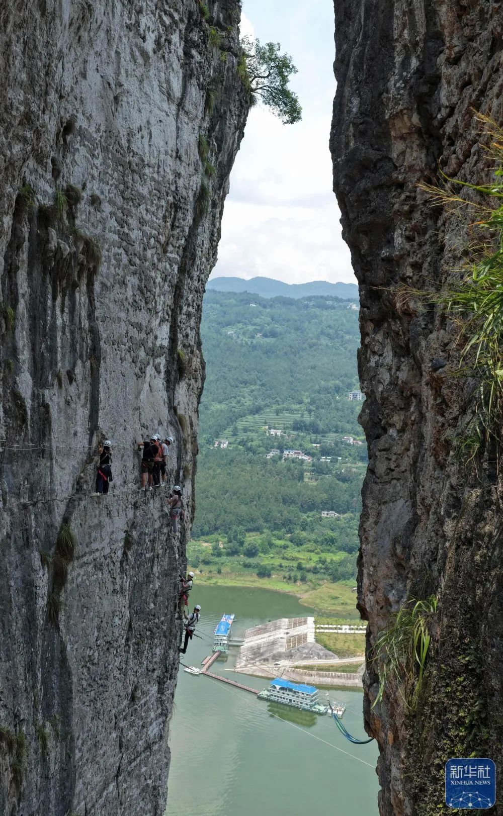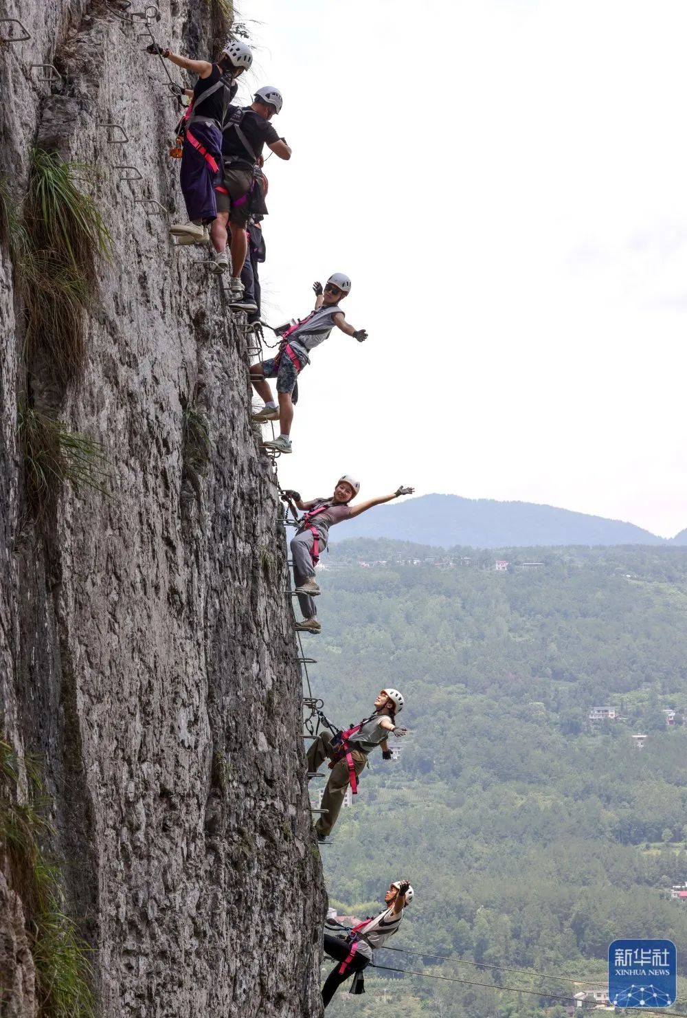 湖北省恩施市新塘鄉紅花峰林景區,游客在體驗“飛拉達”攀巖項目。新華社發(趙軍攝)